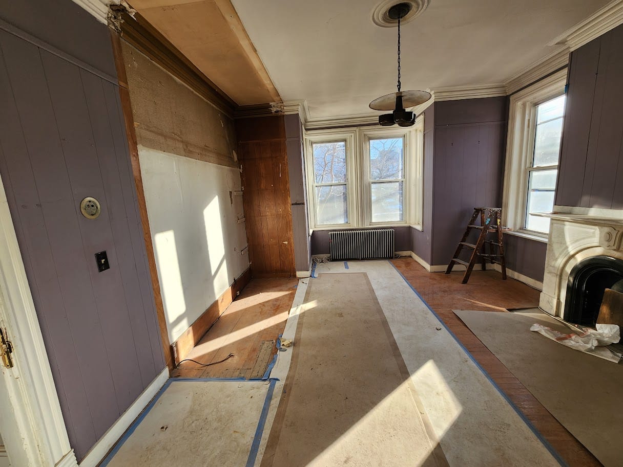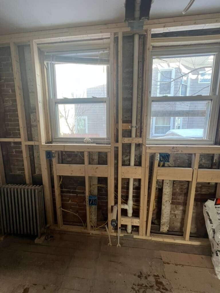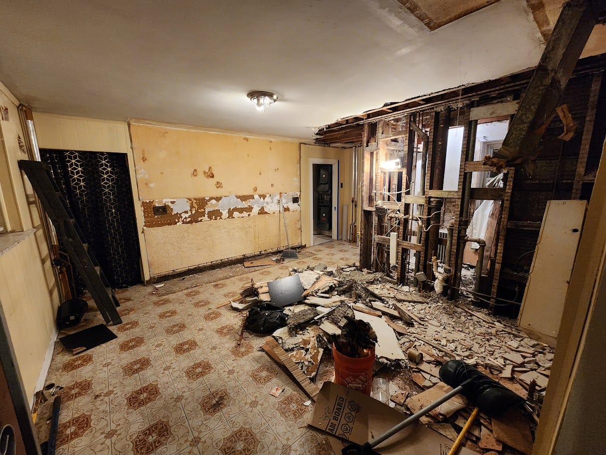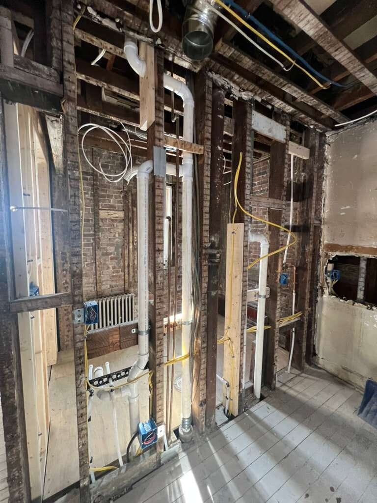 Demolished walls, new plumbing, and much improved wiring