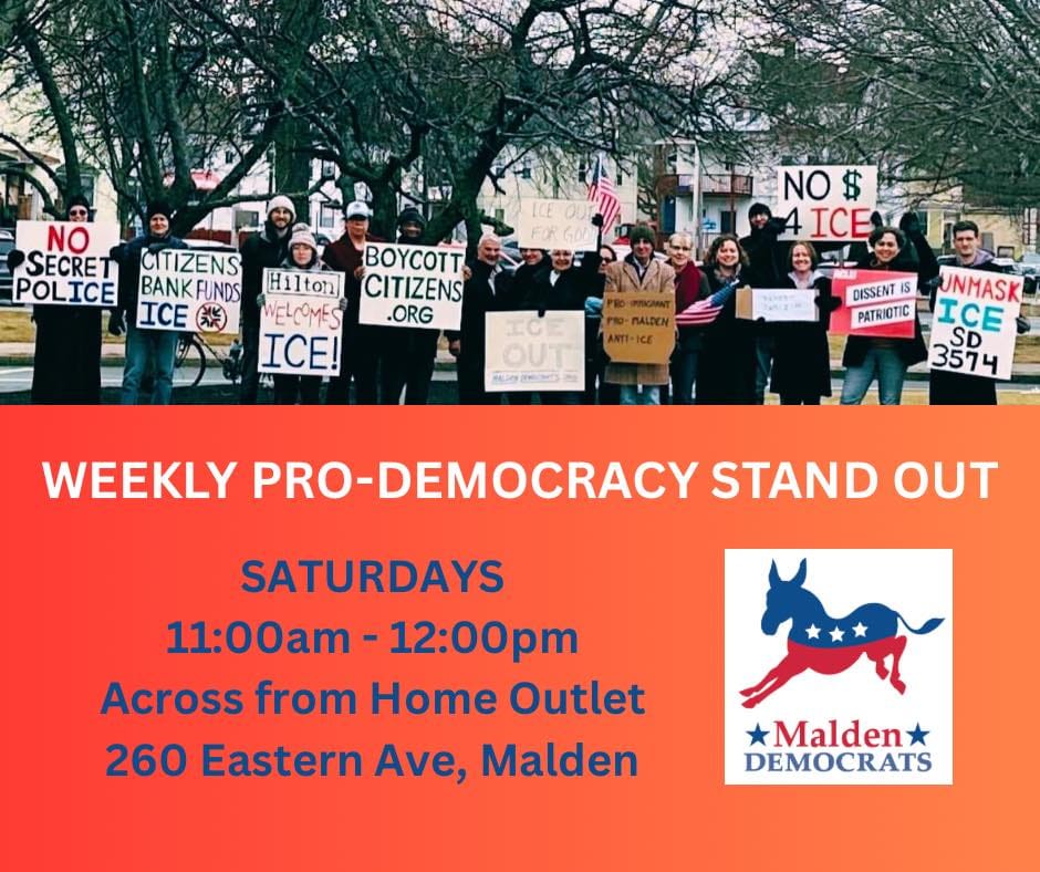 Over the weekend, some of our members attended a standout in Malden to show our opposition to illegal actions by ICE and democratic backsliding in the United States. We'd love if you joined us next Saturday - if you ever want to get in touch, you can always send us a DM on BlueSky.