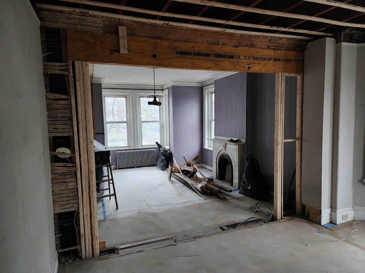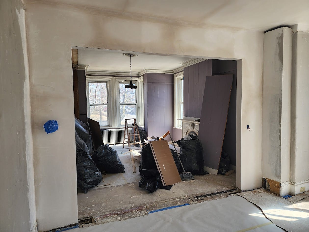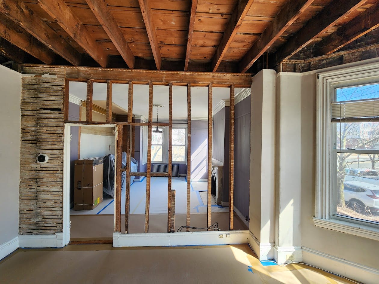 Progress photos of the wall removal, framing, and drywall