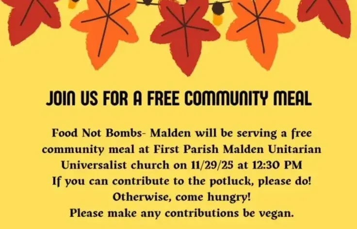 Finally, this isn't our event, but we wanted to boost that Food Not Bombs Malden is hosting a community meal in downtown Malden on Saturday Nov. 29th: