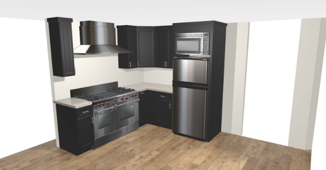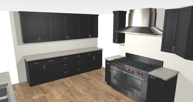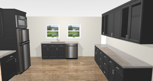 Kitchen renderings after some design changes. Ignore the vinyl floor and "landlord beige"!